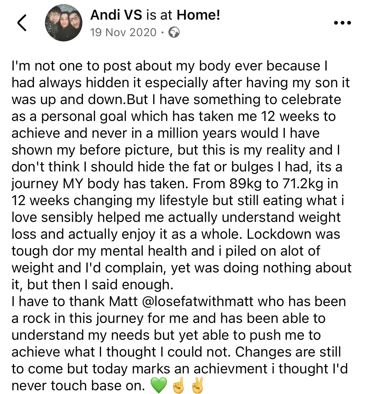 It combines simple nutrition, flexible training (home or gym), accountability and a supportive community so fat loss actually fits around real life - kids, work, weekends and all.