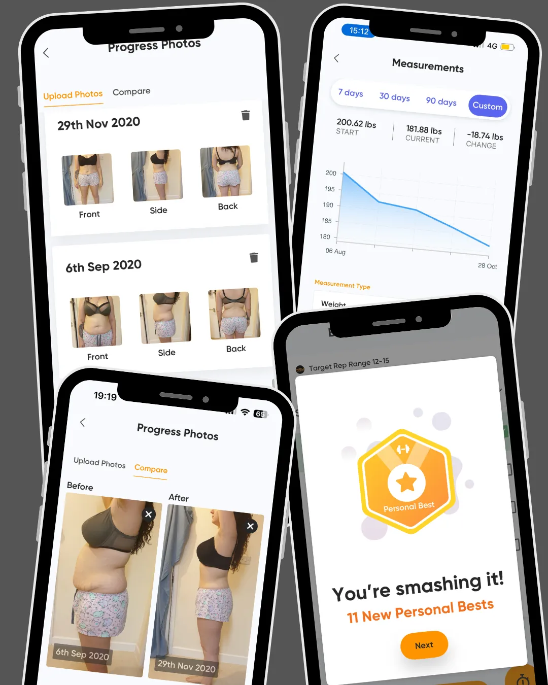 Track your workouts, progress photos, measurements and PBs all in one place — no spreadsheets, no confusion